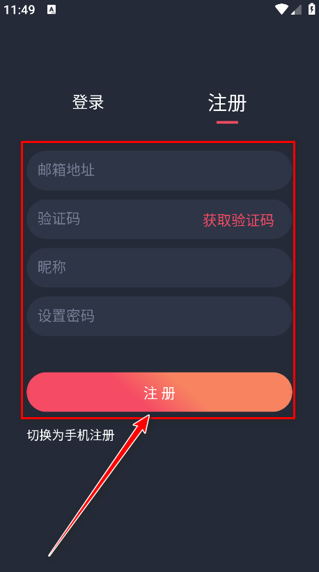 6.输入邮箱地址、验证码、昵称、设置密码,然后点击注册也是可以的。