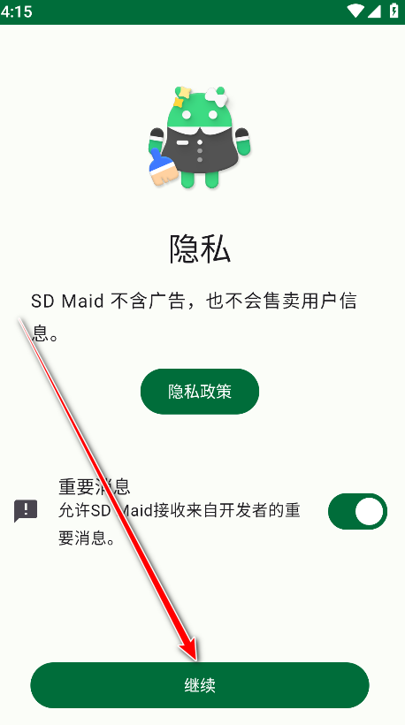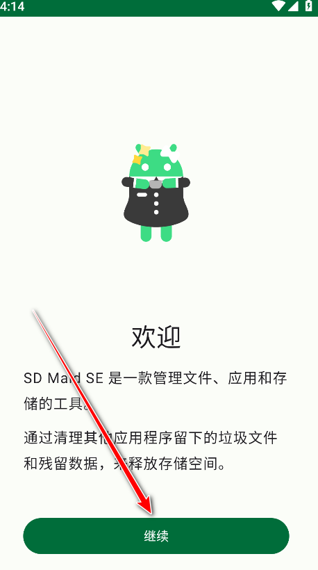 1.首先请有需要的朋友们在本网站本页面直接下载安装并打开最新版本的SD Maid SE,点击继续。