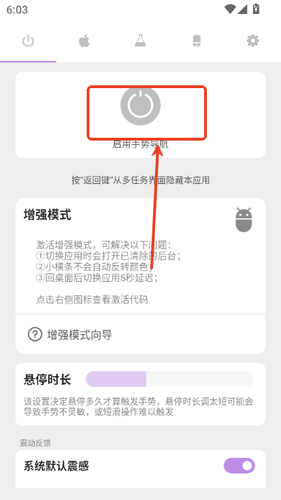1、软件首页就可以看见到这个按钮,点击就开启启用手势导航。