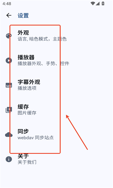 2、在设置页面,包含了外观、播放器、字幕、缓存、同步等多种自定义的设置,根据实际需求来选就行。