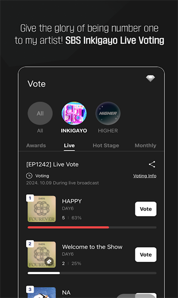 你通过HIGHER参与的投票结果将反映在SBS INKIGAYO每周No.1的评选中。参与每周的SBSINKIGAYO实时投票,为你喜欢的艺人加油打气