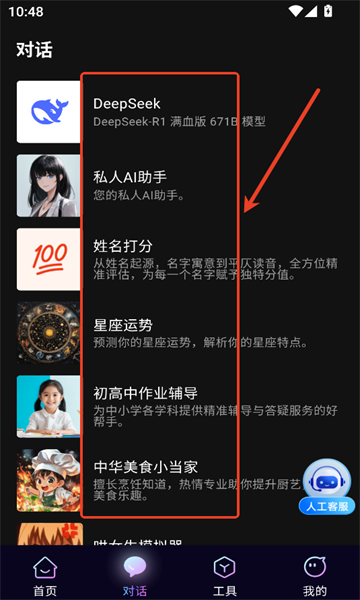 2、在对话栏目,你是看选择多种不同类型的对话,比如姓名打分、私人ai助手、星座运势等。