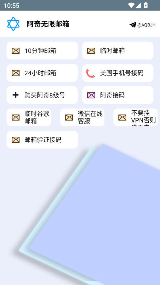 阿奇无限邮箱app是款功能实用,操作便捷的临时邮箱软件,它能够支持多种临时邮箱类型,包括10分钟、24小时以及临时邮箱等,同时还拥有虚拟手机号接码,能够在防止隐私泄漏的同时满足用户不同场景下使用需求,无需登录即可使用。