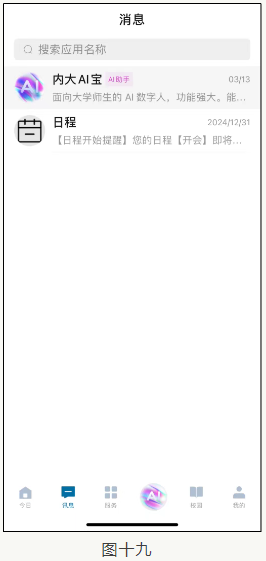 3、讯息页如图十九所示,该页面整合了来自所有渠道的消息通知。其中涵盖日程提醒通知、业务消息通知、视频会议通知等各类消息通知内容,旨在为用户提供便捷、全面的消息接收体验。