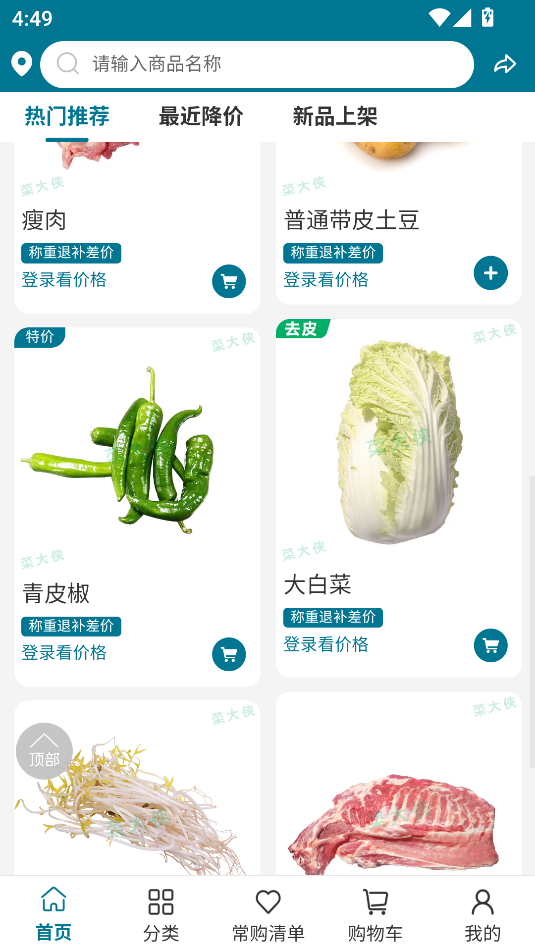1、软件首页就有详细的分类,比如蔬菜水果、鲜肉禽、鲜活水产、豆品蛋类、干货调料等。