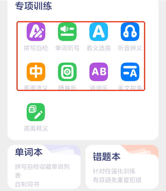 3、在这里包含了丰富的专项训练,比如有拼写自检、单词听写、看义选英、听音辨义等。