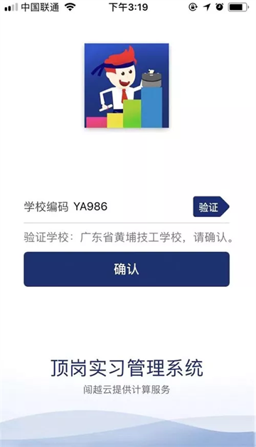 2、输入系统校园编码:如YA986。点“验证”后,出现“验证学校:广东省黄埔技工学校,请确认”