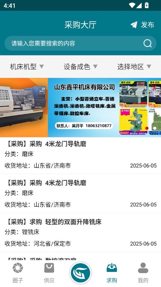 车床圈app是款小众圈子,主要提供车床供求信息,其功能比较实用,信息真实,方便找设备,如果找不到自己想要的可以使用求购功能,能够更快的找到靠谱的二手设备卖家,满足用户需求。
