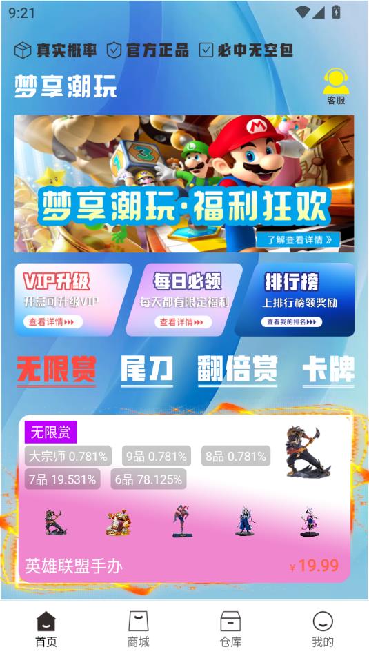 梦享潮玩app是款多样玩法的线上潮玩盲盒商城,融合了多元开盒玩法,提供丰富多样的独家限量版手办、模型、周边等潮玩商品,确保都是正品,满足资深收藏家的需求,所有盲盒商品以及概率都是公开透明,确保没有任何套路,体验真实的线下开盲盒感受。