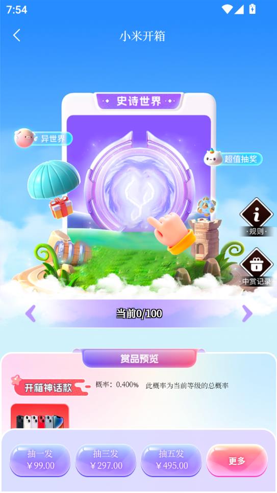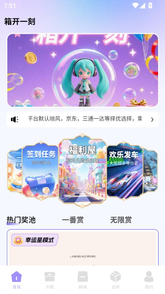 箱开一刻app是款线上潮流盲盒与好物电商平台,整合多种类别的潮流好物,满足用户多元化需求,每一次抽奖都能获得实物,不仅限于盲盒玩法,包括扭蛋、一番赏等,概率以及商品都公开透明,可以根据自己需求选择。