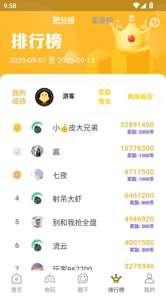 排行榜页面会为所有玩家的积分进行排名,前几名有奖励哦!