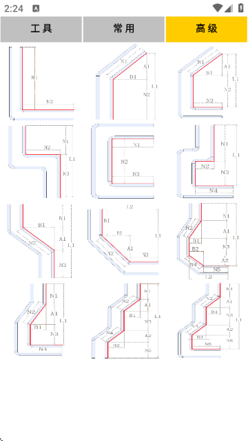 5、若不确定,可先查看软件内置的不同图纸示例(点击 “高级” 查看),