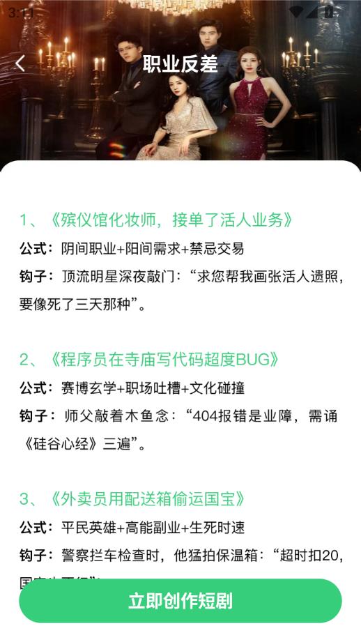 玩转短剧页面提供了不同题材的短剧创作公式。