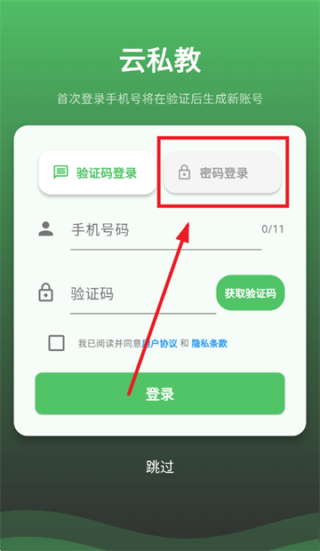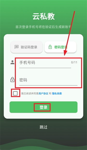 输入手机号,密码,勾选我已阅读并同意用户协议和隐私条款,点击登录即可