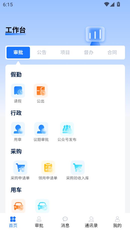 流程审批: 提供请假、报销、采购、项目申报等各类电子化审批流程,支持多级审批、加签、转办等操作。