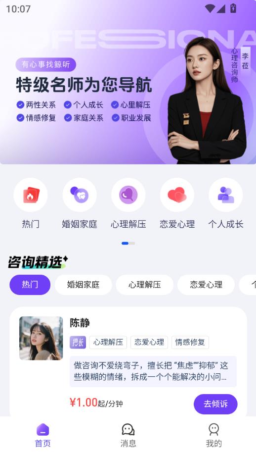 鲸听app是款致力于缓解现代人心理咨询服务的平台,提供专业的心理陪伴,支持24h倾听你的心事,拥有自身心理咨询师团队,无论你正经历焦虑、抑郁、人际关系困扰,还是各方面需求,它都能提供温馨有效的帮助。