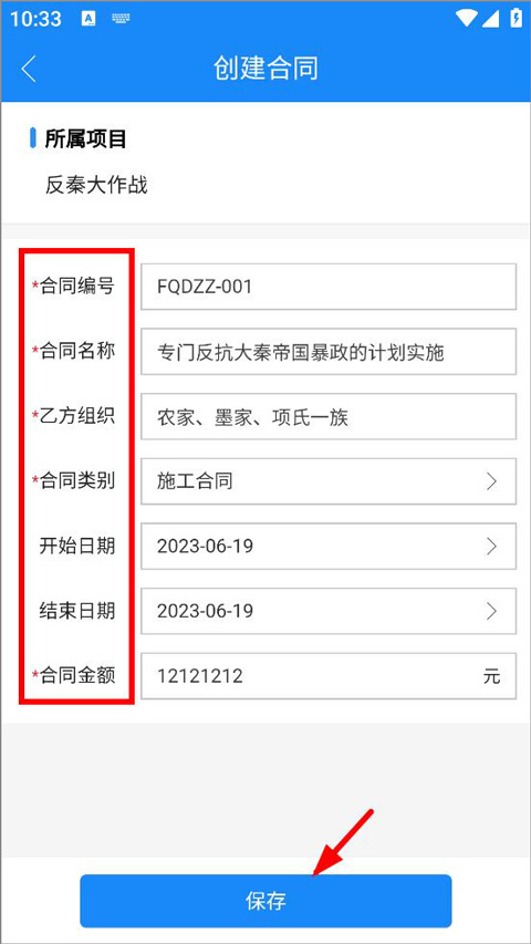 4、在创建合同页面,用户需要填写合同编号、名称、乙方、合同类别、日期、金额等,点击保存即可创建成功。