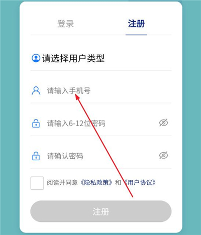 3、选择用户类型,输入手机号,设置密码即可注册。