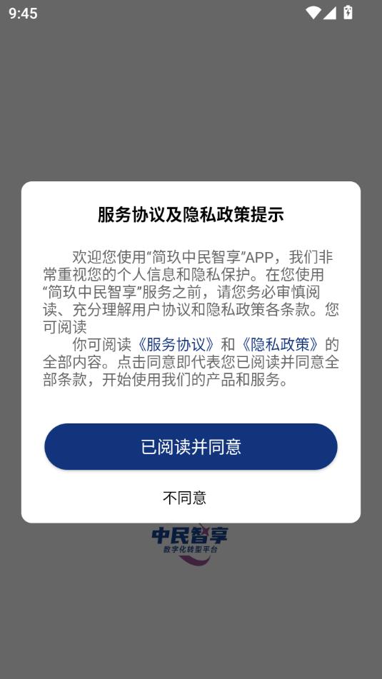 阅读服务协议及隐私政策提示,点击已阅读并同意。