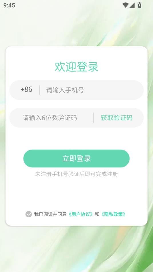 进入软件会自动跳转登陆页面,输入信息点击立即登录,未注册手机号验证后即可完成注册。