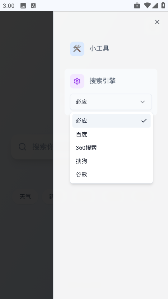 4、再接着点击右上角的三条横线按钮,找到“搜索引擎”。