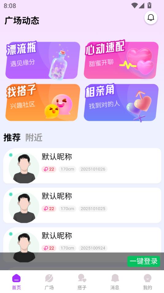 快速匹配:能根据用户的兴趣爱好,秒速推荐有缘人,用户也可通过首页的漂流瓶、心动速配、找搭子、相亲角等板块,快速扩大社交圈。