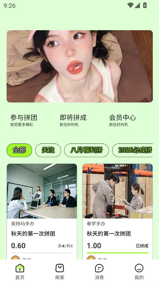 可以在首页中查看各类手办、卡牌的拼团活动。