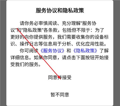 1、下载安装国为乡情app,打开之后点击同意并接受;