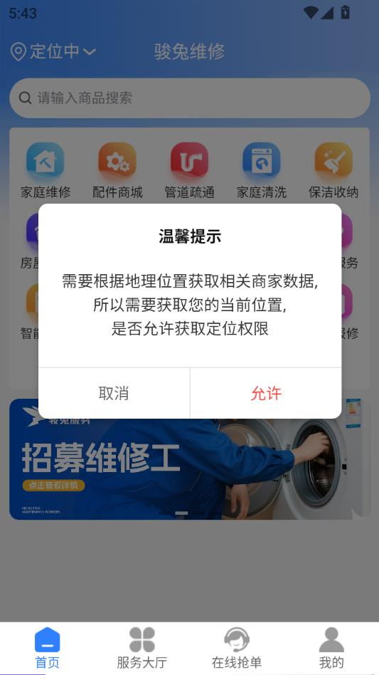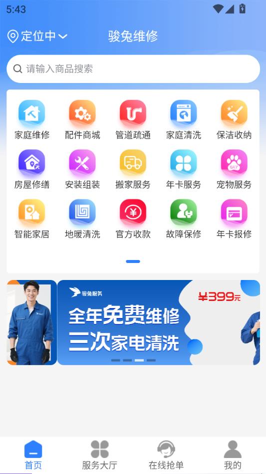 骏兔维修app是款行业综合维修服务平台,不仅限于家电设备,还包括管道疏通、房屋修缮、五金挂件等服务,每位维修师傅都有评级,用户可以对服务进行评分,以便享受更优质的服务体验,平台的所有师傅都具有多年经验且持有健康证。