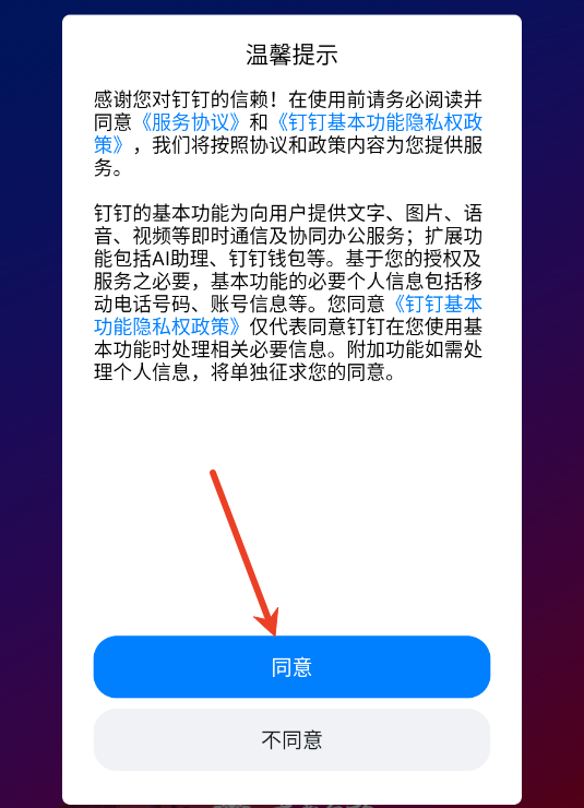 1、您同意《钉钉基本功能隐私权政策》仅代表同意钉钉在您使用基本功能时处理相关必要信息。附加功能如需处理个人信息,将单独征求您的同意。