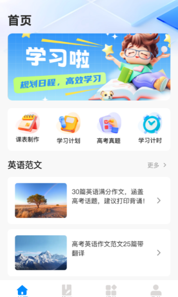 进入首页这里不仅提供了课表制作功能,还拥有许多范文以及学习助手。