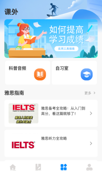 在课外页面可以查看提供的雅思指南学习。