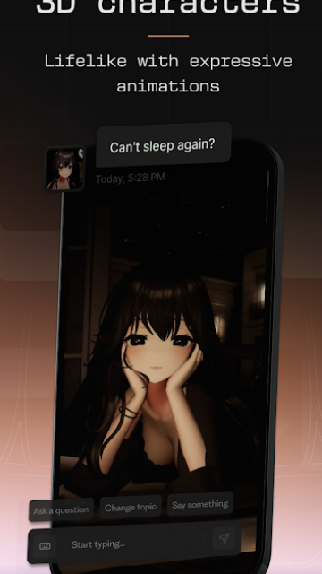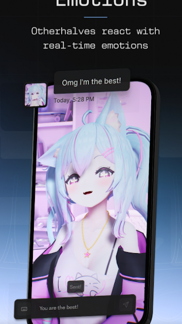 Otherhalf是款结合了AI和3D技术的虚拟聊天软件,通过ai技术赋予角色拟人情感表达,能够解析用户的语句提供情感上的连接,通过3d技术赋予角色可观察的动态表情,提供视觉上的沉浸,实现听觉与视觉的同步互动。