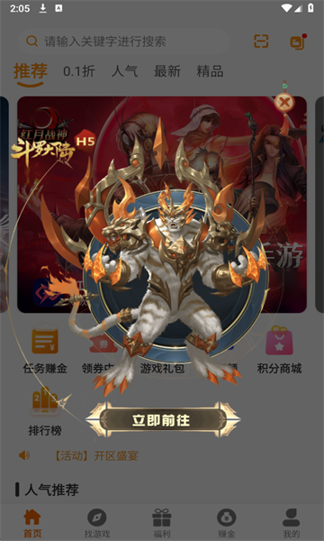 2、成功进入主页之后,我们可以看到任务赚金,领劵中心,游戏礼包等功能版块。