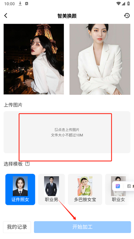 3.这里选择智美换颜功能为例,进入后上传图片,选择合适的模板,点击开始加工即可快速生成