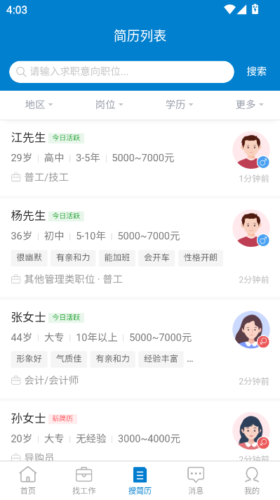 在搜简历页面则可以快速筛选匹配符合要求的人才。