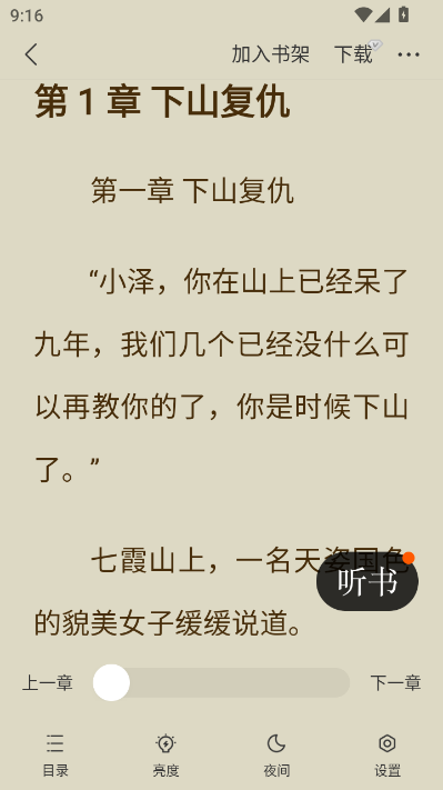 全屏沉浸、手势翻页、亮度/音量调节、听书模式