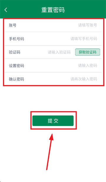 进入重置密码界面后,输入账号,手机号码,验证码,密码,点击提交即可