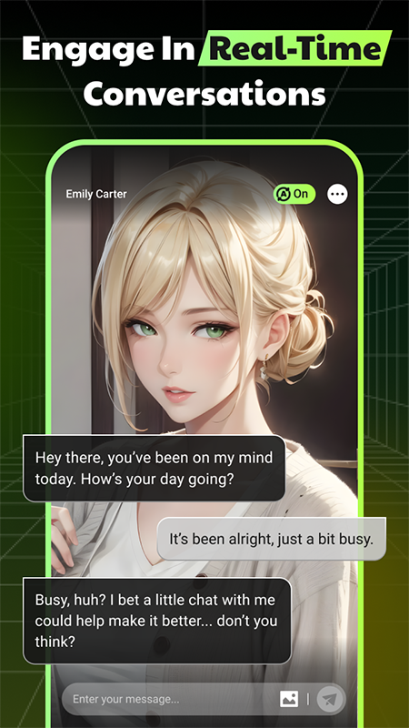 与预设或自定义角色进行开放式对话,支持文字输入、快捷回复、表情包互动。