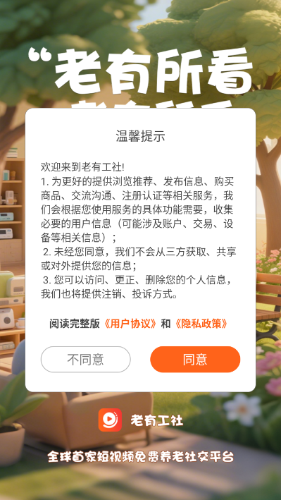老有工社app是国内首个以短视频+养老为核心的创新平台,不仅提供娱乐内容,还提供多种社会保障,构建一个用户既是内容消费者,也是价值共建者与受益者的闭环生态。