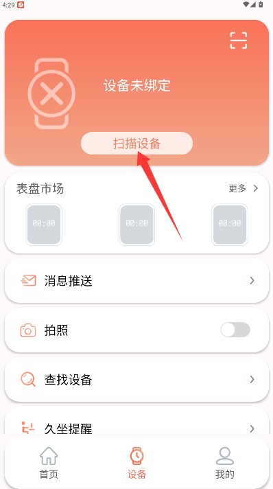 2、在设备管理界面开启手机蓝牙功能,点击扫描设备按钮搜索并绑定智能穿戴设备。
