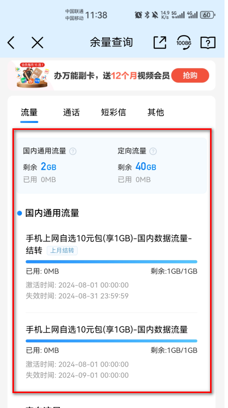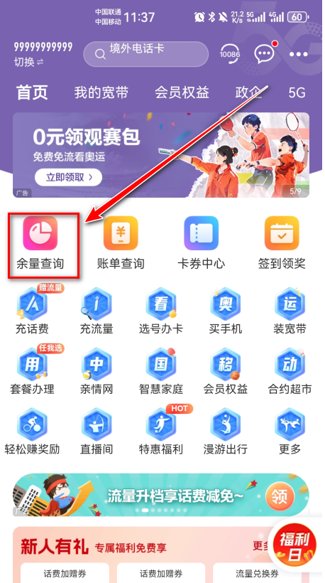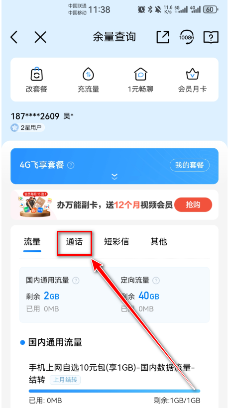 查询实时话费、剩余流量、语音分钟及套餐到期时间。