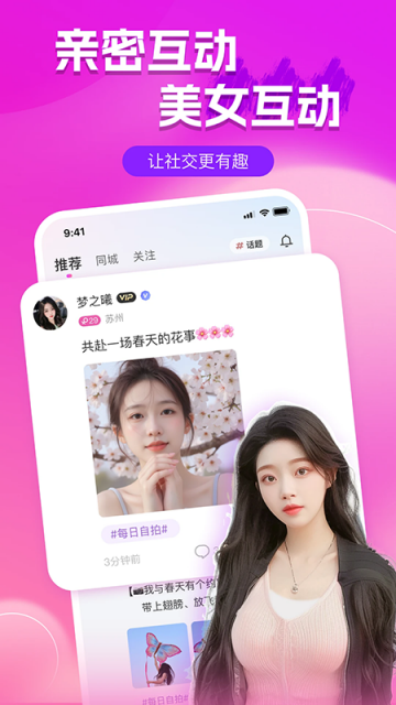 附近陌聊app是款主打同城陌生人交友的软件,专门服务于想要脱单的用户群体,通过智能匹配系统进行精准筛选,结合线上线下的形式帮助双方建立联系,所有的用户都是经过实名认证的,可以放心互动交流。