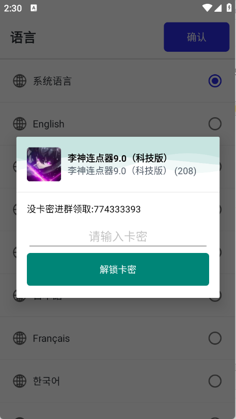 1、用户首先在本站下载李神连点器9.0,输入卡密李神NB。