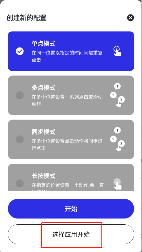 5、选择点击模式以后点击选择应用开始。