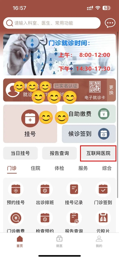 电子就诊卡:一键生成院内电子卡,方便管理个人或家庭成员的就诊档案。