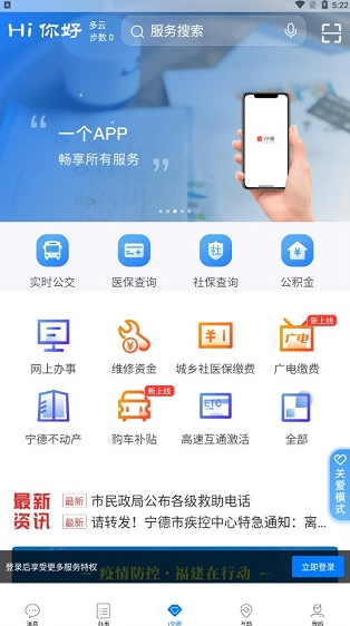 3、登录成功后,在“i宁德”支持实时公交查询、医保查询、社保查询和公积金查询,其下还包括网上办事,维修资金、城乡社医保缴费、广电缴费、宁德不动产、购车补贴、高速互通激活等等。