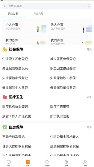 4、在“办事”的服务功能里,你可以根据自身的需求进行选择,是个人办事、法人办事,还是了解社会保障、医疗卫生情况,都可以在这里进行办理相关业务。