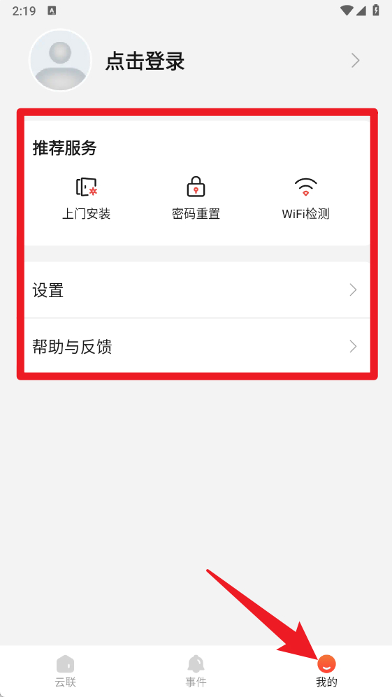 5、底部进入【我的】页,可查看推荐服务,如上门安装、密码重置、WiFi检测,并能进行设置、帮助与反馈。
