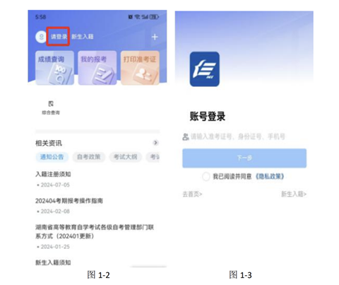 1、考生APP登录个人手机上,点击安装好的潇湘自考APP图标,进入门户首页,如下图1-2 所示,点击左上角的“请登录”连接,进入登录界面。